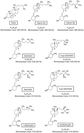 - Kaufmann, M.; Sepiashvili, L.; Singh, R.J. Mass Spectrometry Assays of Vitamin D Metabolites. In Vitamin D: Volume 1: Biochemistry, Physiology and Diagnostics, 4th ed.; Elsevier: Amsterdam, The Netherlands, 2017; pp. 909–923. ISBN 9780128099667. [Google Scholar]