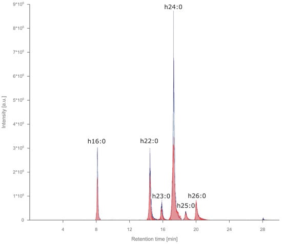 Extracted ion chromatogram of glycosyl inositol phospho ceramides (GIPCs) in salad samples analyzed by RP-HRMS/MS analysis using ddMS2 in positive (red) and negative (blue) ion modes. Assigned GIPCs belong to the Hex-HexA-IPC series with a t18:1 long-chain base (LCB) and varying chain length of the hydroxylated saturated fatty acids. Retention times coincided in positive and negative ion modes. Increasing carbon numbers result in belated elution.