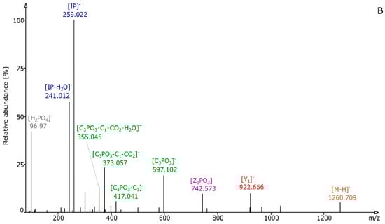 GIPCs are the major sphingolipids on earth []. Hence, it is important to understand their function and distribution in plants and fungi. However, GIPC analysis remains extremely challenging, as tailored extraction strategies for this glycolipid class are necessary. GIPC analysis is in its infancy due to the lack of standards and databases. In this work, we present the first automated high-throughput GIPC annotation workflow which is based on RP-HRMS/MS. By using a novel 30 min gradient based on isopropanol with a reversed-phase column, packed with sub 2-µm particles, fast GIPC analysis was possible at the same time avoiding standard eluent use of tetrahydrofuran. Four different plant samples were analyzed. For salad and spinach, literature information has been available [,], while for raspberry and strawberry, GIPC profiles were completely uncharacterized. Using strict filtering by (1) accurate mass determination (±5 ppm) with matching retention times for both ion modes in MS1, (2) MS2 spectra with characteristic fragments and (3) expected retention time series, we produced a database of 64 GIPCs (Table A1). As no GIPC standards are available, only GIPC annotation hits with level 2 and 3 confidence [] were possible. The most prominent MS2 fragments for GIPCs are [IP] fragments in both ion modes ([H]−: m/z 241, 259; [H]+: m/z 261; [Na]+: m/z 283). However, additional sugar or ceramide fragments are essential for correct GIPC annotation. The high MS2 mass range coverage (m/z 65 to 2500) provided by the Orbitrap was beneficial to determine GIPC low mass fragments such as m/z 79 [PO3]− or 97 [H2PO4]−, besides high mass precursors such as 1261 [M − H]− (Figure 2).