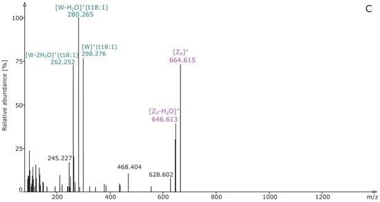 Overview of the GIPC fragmentation for the example of GIPC A-OH-t18:1/h24:0 in salad: (A) The fragment assignment of GIPC A-OH-t18:1/h24:0 (adapted from []). The W fragment is shown in a light blue color. Please note that a full structural characterization is not possible by RP-HRMS/MS, (B) The product ion spectrum in negative ion mode at m/z 1260.7237, showing characteristic fragments m/z 241 and 259, 355, 373 and 417. The sugar head group was confirmed by the [C3PO3]− fragment (m/z 597, R1 = OH). [Z0PO3]− and [Y1-H]− fragments prove the ceramide moiety. (C) The positive ion mode ddMS2 spectrum of the [M + H]+ precursor, exhibiting the [W]+, [W-H2O]+ and [W-2H2O]+ fragments at m/z 298, 280 and 262, which are characteristic for the t18:1 LCB.
