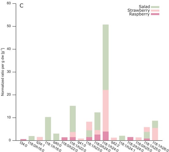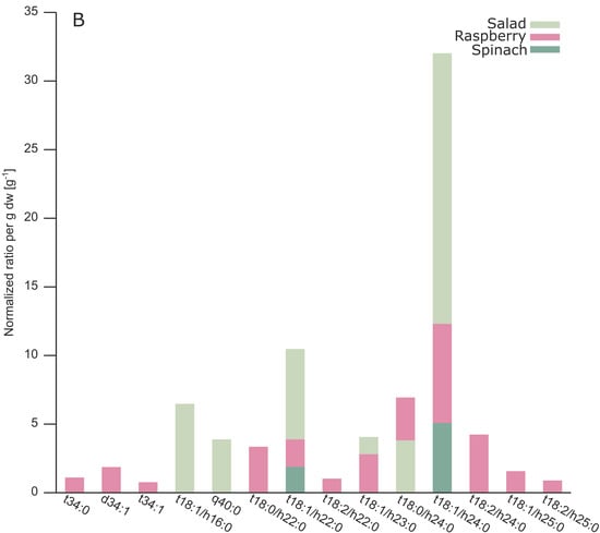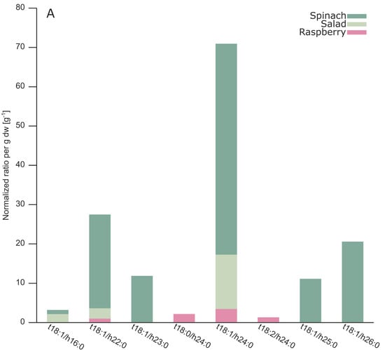 Within the annotated GIPCs with structural information on LCB and fatty acyl composition, t18:1 followed by t18:0 and t18:2 were the most prominent LCBs in the analyzed plants (Table A1). For GIPCs containing N-acetylamine residues t18:1 was the most abundant LCB with regard to normalized ratios per gram dry weight (Figure 3A). The same holds true for the amine or hydroxyl group containing GIPCs, with additional high abundance of t18:0 LCBs (Figure 3B,C). While in spinach solely t18:1 LCBs were detected, salad, strawberries and raspberries show more variation in terms of LCB composition with presence of both t18:1 and t18:0 (Table A1).