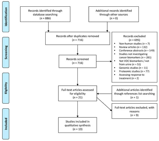Preferred Reporting Items for Systematic Reviews and Meta-Analyses (PRISMA) flow diagram. VOC: volatile organic compound. The systematic literature search identified 886 studies, with 13 studies included after screening and assessment for eligibility.