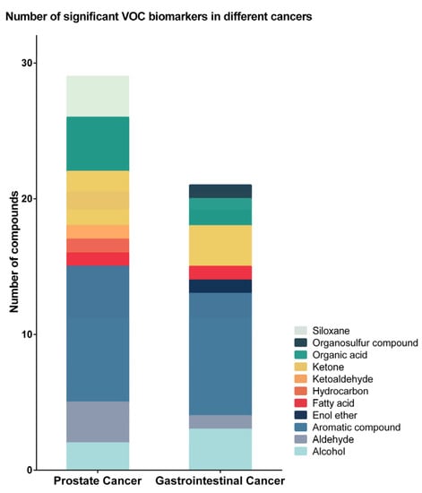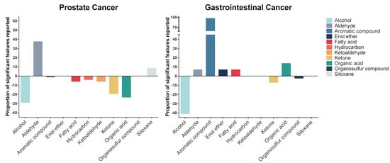 Proportion of identified compound chemical classes in different cancers. Most prostate cancer-related VOCs showed decreased concentrations in the urine of prostate cancer patients compared to the urine of non-cancer patients. The majority of the gastrointestinal cancer-related VOCs showed increased concentrations, particularly of aromatic VOCs.
