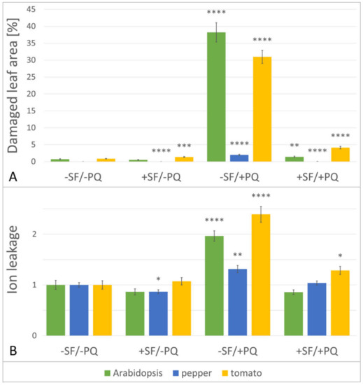 The results show that ion leakage is invariant between −SF/−PQ and +SF/−PQ samples in Arabidopsis and tomato, while in pepper there was a slight reduction after application of SF (Figure 2, panel B). By contrast, as expected the percentage of leaked ions significantly increased in PQ only treated samples (−SF/+PQ) in all three species. Remarkably, the pre-treatment with SF of PQ stressed leaves (+SF/+PQ) resulted in considerably reduced amounts of ion leakage, demonstrating the protective properties of SF and the effective mitigation of the applied oxidative stress. In the case of Arabidopsis and pepper, the EL values returned to the control levels, while in tomato they remained slightly higher.