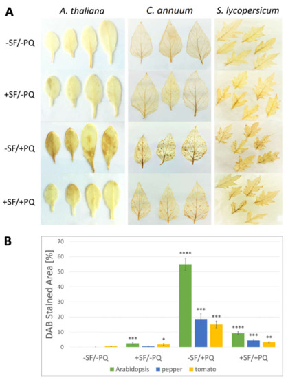 The level of stained H2O2 appears to be low in both −SF/−PQ and +SF/−PQ leaves, as no apparent brown precipitation was observed (Figure 3, panel A). On the other hand, in PQ treated leaves (−SF/+PQ) the stained H2O2 is more prominent in all the three species. The pre-treatment with SF of PQ-stressed leaves clearly leads to an overall reduced area of brown spots, confirming that SF is able to hinder ROS accumulation in stressed tissues. The graph of Figure 3 (panel B), shows the percentage of the area of DAB-stained lesions under the different conditions. In PQ-only treated Arabidopsis, pepper and tomato leaves, 55%, 18% and 15% of the leaf area, respectively, was stained. By contrast, +SF/+PQ samples displayed only 9%, 4% and 3% stained area in Arabidopsis, pepper and tomato, respectively. These results suggest that the mechanism through which SF protects the living tissues includes limitation of the oxidative load. It must be noted that the effect of PQ does not seem to be completely blocked by SF, since some H2O2 buildup is detected also in the +SF/+PQ variants.