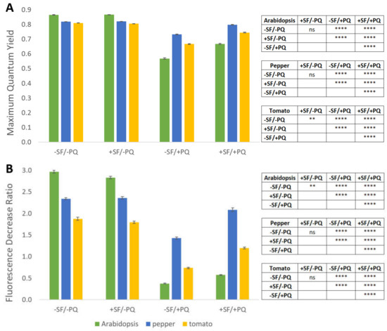 SF pretreatment alleviates the reduction of chlorophyll fluorescence parameters induced by oxidative stress. The maximum quantum yield (A) and fluorescence decrease ratio (B) in dark-adapted Arabidopsis, pepper and tomato plants (n = 12), treated or not with SF and PQ, were measured by PAM fluorometry. Data are means ±SEM of three biological replicates. Differences between two single treatments were tested by Welch’s t-test, with p < 0.05. Statistical significance relative to controls from the same species is indicated in the Table as follows: p ≤ 0.0001 (****), p ≤ 0.001 (***), p ≤ 0.01 (**), ns = not significant.