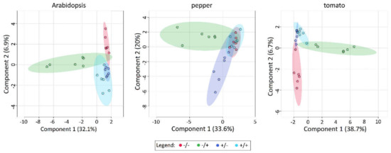 In contrast to PCA, Sparse Partial Least Squares Discriminant Analysis (sPLSDA) is a supervised technique, where each sample’s group is defined in advance, enabling more efficient separation [32]. The same datasets were additionally analyzed with the sPLSDA function of MetaboAnalyst and the 2D Scores plots were compared. The sPLSDA analysis demonstrates that a high level of variation in the metabolome of Arabidopsis, pepper and tomato among treatment conditions can be explained by the first component (>32.1%, 33.2% and 38.5% respectively; Figure 5). In each of the sPLSDA plots, the oxidatively stressed group (−SF/+PQ) deviates from the other treatment groups, an effect observed for each plant species assessed. In contrast, the remaining treatments (−SF/−PQ, +SF/−PQ and +SF/+PQ), clustered closely together along the first component. This indicates a high similarity at the metabolomic level between the SF-treated plants and unstressed plants, which closely resembles the observations from the phenotype analysis (Figure 2, Figure 3 and Figure 4). Comparably to the PCA plot (Supplementary Figure S2), in the pepper sPLSDA, +SF/−PQ had a high variation, although clearly divided from the rest of the treatments. In this crop, +SF/+PQ completely overlapped with the negative control, indicating high degree of rescue, while in the other two species, the overlapping occurred between +SF/−PQ and +SF/+PQ variants.