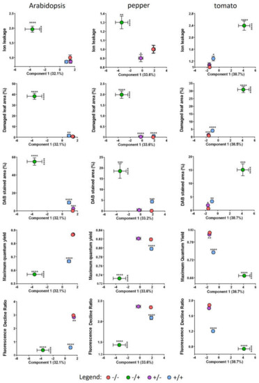 A scatter plot of plant phenotypes and sPLSDA component 1 values demonstrates a close clustering of the SF treated plants with unstressed plants (Figure 6). For all three species, the +SF/+PQ group was observed to cluster close to the unstressed groups (+SF/−PQ and −SF/−PQ), particularly in the case of ion leakage, damaged leaf area and DAB staining. In terms of the maximum quantum yield and fluorescence decline ratio, a similar distribution was observed in pepper, with +SF/+PQ clustering closely with the unstressed groups (+SF/−PQ and −SF/−PQ). In the case of Arabidopsis and tomato, the +SF/+PQ group clustered between the unstressed groups (+SF/−PQ and −SF/−PQ) and the oxidatively stressed group (−SF/+PQ). Close clustering according to phenotype was not observed for the second component which accounts for less of the variation in metabolic changes between groups (Figure 5 and Supplementary Figure S4). Overall, these data indicate that the metabolomic changes induced by SF are strongly correlated to the visible plant phenotypes obtained. Moreover, the data suggest that treatment with SF prevents stress responses being induced by PQ. This effect is manifested at both the metabolomic and phenotypic level and for all three plant species assessed.