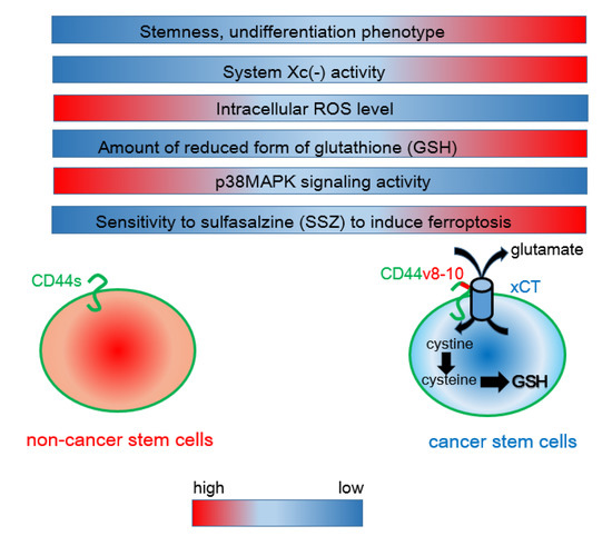 Interaction between CD44 variant 8-10 (CD44v8-10) and the xCT antiporter determines the resistance to oxidative stress. Unlike mesenchymal cancer cells expressing CD44 standard (CD44s), CD44v8-10-positive cancer stem-like cells exhibit robust system Xc(-) activity, resulting in enhanced uptake of cystine. Given that cysteine is a rate-limiting factor for the synthesis of the reduced form of glutathione (GSH), CD44v8-10-expressing cancer cells show a phenotype of increased resistance to redox stress. Sulfasalazine (SSZ) inhibits the xCT transporter and is therefore effective for blocking the CD44v8-10-xCT-GSH axis.