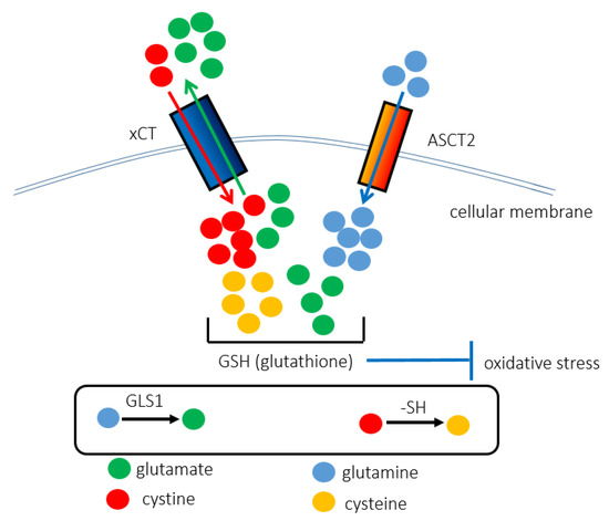The interaction between ASCT2 and xCT contributes to the synthesis of GSH, rendering cancer cells resistant to redox stress. The xCT (SLC7A11) antiporter is responsible for importing cystine instead of exporting glutamate. ASCT2 (SLC1A5) promotes the uptake of glutamine. Glutamine and cystine are chemically converted into glutamate and cysteine, respectively. As GSH is composed of cysteine, glutamate, and glycine, the cooperative function of ASCT2 and xCT underlies the anti-oxidant stress machinery. That is why ASCT2-targeted therapy increases intracellular redox stress levels and induces ferroptosis, iron-dependent cell death.