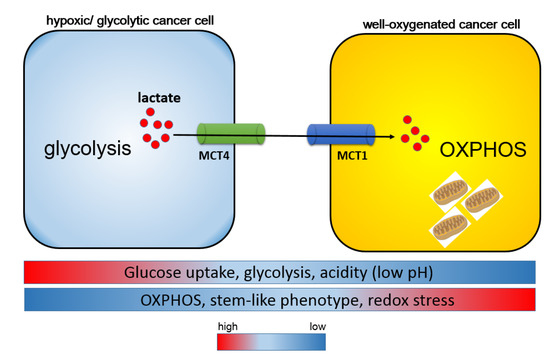 However, all the types of cancer cells do not necessarily exhibit the reverse the Warburg effect. Tumors that express high levels of MCT4 or those with the mesenchymal phenotype fail to exhibit the reverse Warburg effect. Instead, hierarchical metabolic heterogeneity occurs: while MCT4-positive cancer cells depend on aerobic glycolysis and secrete lactate mediated by MCT4, MCT1-positive cancer cells import lactate through MCT1 and exhibit OXPHOS in mitochondria. In addition, the amount of glucose uptake is low in MCT1-positive cancer cells as compared with that in MCT4-expressing cells [124,125]. This metabolic heterogeneity is referred to as metabolic symbiosis, and this type of lactate shuttle is also observed between neurons and astrocytes in normal brain tissues [126]. It is notable that normal and cancerous tissues share finely regulated mechanisms of metabolic symbiosis. Remarkably, well-oxygenated cancer cells, which express high levels of MCT1, efficiently produce metabolic intermediates, as well as ATP and lactate, by utilizing lactate derived from hypoxic tumor cells expressing high levels of MCT4 (Figure 3). Redox stress is a major hallmark of malignant neoplasms, which drive the robust metabolism in adjacent proliferating MCT1-positive cancer cells in which a high amount of mitochondria exists; this is mediated by the paracrine transfer of mitochondrial fuels characterized by lactate, pyruvate, and ketone bodies [124,125].