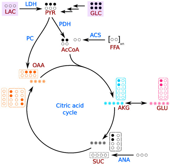 - Jeffrey, F.M.; Storey, C.J.; Sherry, A.D.; Malloy, C.R. 13C isotopomer model for estimation of anaplerotic substrate oxidation via acetyl-CoA. Am. J. Physiol.-Endocrinol. Metab. 1996, 271, E788–E799. [Google Scholar] [CrossRef]