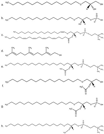 - Magnusson, C.D.; Haraldsson, G.G. Ether lipids. Chem. Phys. Lipids 2011, 164, 315–340. [Google Scholar] [CrossRef]