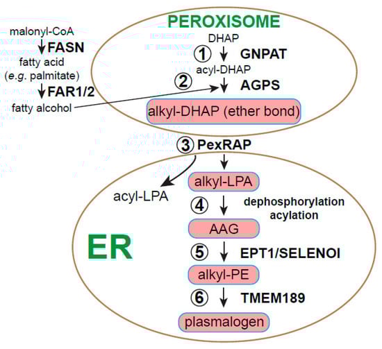 The products of AGPS, various alkyl-DHAPs, are simultaneously reduced and exported from the peroxisome en route to the ER as 1-O-alkyl-2-lyso-sn-glycero-3 phosphate or alkyllysophosphatidic acid (alkyl-LPA). Even though this pathway has been known for quite some time, the reductase/lipid transporter responsible termed peroxisome reductase activating PPARγ (PexRAP or DHRS7B) has only recently been identified in mice []. Acyl products of GNPAT that are not substrates for AGPS can also be reduced and exported from the peroxisome as LPA; however, most LPA is produced from lysophosphatidylcholine (LPC) in the blood by autotaxin, a circulating enzyme with phospholipase D-like activity [,]. Alkyl-LPA is further modified in the ER, undergoing acylation at the sn-2 position by an acyltransferase distinct from GNPAT and dephosphorylation at the sn-3 position by a phosphatidate phosphatase activity. This alkylacylglycerol (AAG) intermediate serves as a substrate for the enzyme ethanolamine phosphotransferase 1 (EPT1/SELENOI), which uses CDP-ethanolamine to add an ethanolamine group to AAG to make alkyl-PE, otherwise known as plasmanylethanolamine (plasmanyl-PE) []. EPT1 is mutated in certain patients with neurological disorders who display abnormal myelination of neurons and abnormal brain development [,]. Skin fibroblasts isolated from these patients showed reduced long-chain acyl-PE and alkyl-PE synthesis. Interestingly, skin fibroblasts synthesized normal levels of the major ester-linked lipids PC and PE, yet accumulated ether-linked PC (plasmanyl-PC), inferring that AAG substrates for EPT1 are repurposed by choline phosphotransferases. Similar reductions in PE were detected in HeLa cells bioengineered to lack EPT1 [] or in yeast cells expressing human EPT1 with an R122P point mutation, which showed greatly reduced enzymatic activity []. Thus, EPT1 is the dominant enzyme responsible for long-chain plasmanyl-PE biosynthesis, which appears to be essential for normal neurological development.
