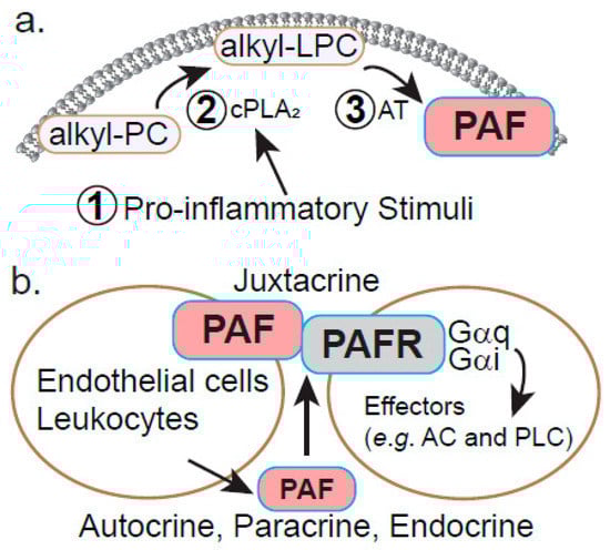 PAF exerts its biological effects via cell-associated/juxtacrine signaling or through secretion. (a). Stimulated PAF biosynthesis occurs in cells responding to pro-inflammatory stimuli (1). This causes calcium-dependent activation of cPLA2, which cleaves sn-2 arachidonyl groups from ether-linked PC species (alkyl-PC) and produces alkyl-lyso-PC (alkyl-LPC), while simultaneously initiating eicosanoid synthesis through arachidonate (2). PAF can also be derived from PC-containing plasmalogens (not shown). (3) Finally, alkyl-LPC serves as a substrate for an acetyltransferase such as LPCAT to generate PAF. (b). PAF can signal through several mechanisms: in endothelial cells and certain leukocytes, PAF remains largely cell-associated and interacts with a GPCR (PAFR) on target cells to promote signaling downstream of the Gαq and Gαi heterotrimeric G proteins. Alternatively, PAF can be secreted and interact with PAFR locally (autocrine or paracrine) or distally (endocrine) to stimulate inflammation.