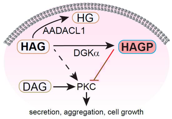 HAG modulates PKC signaling in distinct cell types. In platelets and certain cancer cells, exogenously added HAG is deacetylated by the serine hydrolase AADACL1 to yield its inactive metabolite HG, which may serve as a precursor for other ether lipids and/or contribute to membrane dynamics. In platelets and ovarian carcinoma cells, HAG can also be phosphorylated by a DGKα-like lipid kinase to generate HAGP, which inhibits PKC activity and platelet activation (red line), likely by interfering with DAG binding to PKC isoforms. In contrast, HAG may enhance PKC-dependent cell growth in smooth muscle cells through an unknown mechanism (dashed line). Adapted from Holly et al. []