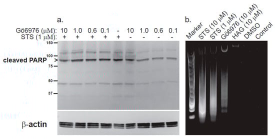 Evidence from our lab supports this antagonistic paradigm between cPKC and nPKC isoforms in cancer cells. In the leukemic megakaryoblastic cell line, CMK11–5 [,], the bacterial metabolite and nonselective PKC inhibitor staurosporine caused caspase-dependent intrinsic apoptosis, as measured by proteolytic cleavage of the caspase-3 substrate PARP and genomic DNA fragmentation (Figure 5). Apoptosis was not reversed by the small molecule inhibitor Gö6976, which selectively targets cPKC isoforms PKCα, PKCβ and PKCβII, nor was apoptosis blocked by the previously mentioned ether lipid HAG at 1–20 µM. HAG was rather inert in this system, since it neither caused nor protected against staurosporine-induced apoptosis. Interestingly, Gö6976 alone at the highest concentration tested (10 µM) induced DNA fragmentation/ladder formation comparable to that of staurosporine (Figure 5). These data suggest that conventional PKC isoforms tonically protect against caspase-dependent apoptosis in megakaryocytic cells, but since only small molecule inhibitors were used, this conclusion should be corroborated using more selective methods (e.g., genetics).