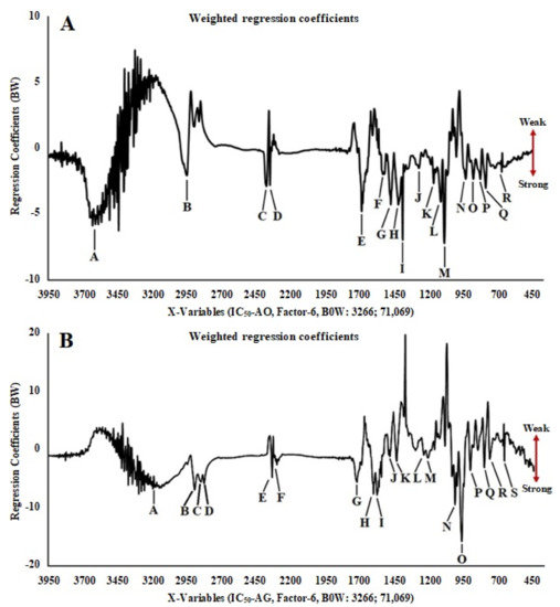 Partial least squares (PLS) plot weighted regression coefficients (important variables) of antioxidant (A) and α-glucosidase inhibitory (B) activities in 70% ethanol extract of C. orchioides and C. latifolia using FTIR spectra.
