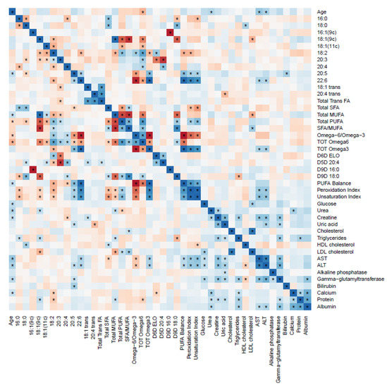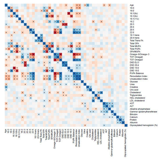 Heat map of the correlations between red blood cell membrane fatty acids and biochemical parameters for children with obesity. The color represents the Spearman correlation coefficient (ρ) (blue = positive; red = negative). * Represent significant correlations (p < 0.05) between variables. The pair variables that have an * above and below the diagonal line are significantly correlated after correction for multiple comparisons (q < 0.05).