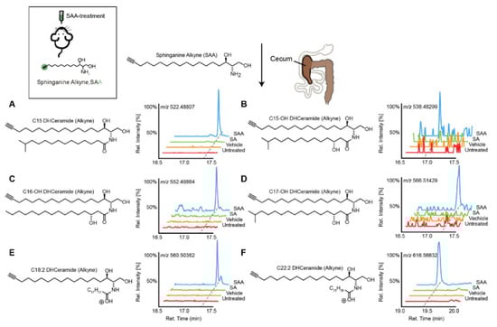 Transformation of dietary sphinganine into dihydrocermides by the gut microbes. Here, sphinganine alkyne (SAA) was given to mice by oral gavage (five consecutive days), then the fecal content from mice was collected and metabolic consequences of SAA exposure were determined using high-resolution mass spectrometry ion chromatograms. The authors showed a distinct cecal lipidome chromatograms for mice that orally treated with SAA (blue), which contained the alkyne-bearing (A) C15-, (B) C15OH-, (C) C16OH-, (D) C17OH-, (E) C18:2- and (F) C22:2- dihydrocermides. However, these dihydrocermides were absent in treatments with sphinganine (SA, green), vehicle or no treatment (red). Figure adapted from [40], with permission under CC BY 4.0 license.