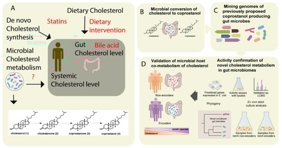 The metabolism of cholesterol by gut microbes influences both intestinal and circulating cholesterol concentrations. (A) The cholesterol level in the blood can be influenced either by de novo cholesterol synthesized in the liver or it may be derived from exogenous sources such as the diet. The endogenous cholesterol level may be also influenced by drugs such as statins, or via altered bile acid metabolism. In addition, gut microbial metabolism of cholesterol may also serve as check point for the maintenance of cholesterol homeostasis (B). As shown in panel A, the authors proposed a pathway for microbial conversion of cholesterol (1) to coprostanol (4) in the microbiota involves the intermediates cholestenone (2) and coprostanone (3). (C) By using genome mining, Kenny et al. identified and characterized microbial enzymes linked with cholesterol metabolism. Later, integrating the functional metagenomics and metabolomics data, they predicted as well as validated a group of microbes and their microbial activities (microbial cholesterol dehydrogenases) which mediated the metabolism of cholesterol in the gut (D). Figure adapted from [52] with permission under CC BY 4.0 license.