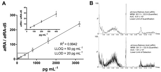 For the 7 point calibration, the ratio between atRA and atRA-d5 was used for quantification. The obtained calibration coefficients (R2) for 7 point calibration (50–3200 pg·mL−1) were > 0.99 (Figure 1A). The achieved lower limits of detection and quantification were 20 and 50 pg·mL−1, respectively (Figure 1A,B).