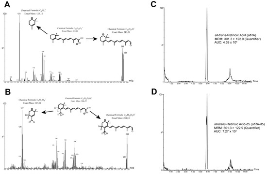 Multiple reaction monitoring (MRM) chromatograms and total ion chromatograms of atRA/atRA-d5. (A) Extracted MRM spectrum (quantifier/qualifier) of atRA. (B) Extracted MRM spectrum (quantifier/qualifier) of atRA-d5. (C) Total ion chromatogram of atRA in a control subject (1.02 ng·mL−1). (D) Total ion chromatogram of atRA-d5 in the same control subject as in (C).