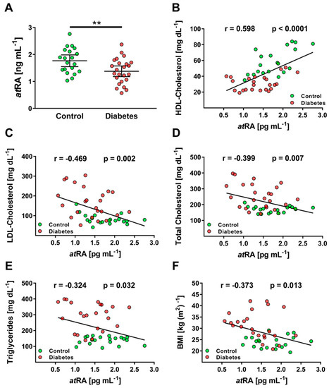 Using the developed LC–MS/MS method, plasma levels of atRA were found to be in the range of 0.57 to 2.76 ng·mL−1 in all patients. A cohort of patients with poorly controlled Type 2 diabetes displayed hyperlipidemia, increased C-reactive protein, and blood glucose concentration, as well as excessively increased HbA1c (Table 4). In patients with poorly controlled Type 2 diabetes, atRA levels were significantly lower, with 1.38 ± 0.42 ng·mL−1, as compared to healthy individuals with 1.77 ± 0.45 ng·mL−1 (p < 0.01; Figure 3A). In addition, plasma atRA levels were strongly associated with the lipid profiles of the whole cohort (n = 44), especially for high-density lipoprotein (HDL; r = 0.598; p < 0.001) and low-density lipoprotein (LDL) cholesterol (r = −0.469; p < 0.01), and also for body-mass index (BMI) and triglyceride concentration (Figure 3B–F). In a cohort of patients with well-adjusted Type 2 diabetes, atRA levels decreased (1.47 ± 0.37 ng·mL−1), but this was statistically not significant (p = 0.053 vs. controls; Supplementary Table S2).