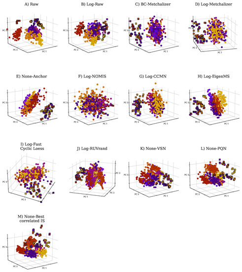 Principle Component Analysis (PCA) plots for raw data and normalized data as indicated by the title of each panel. Each batch is indicated with a unique color. PCA was performed on 431 features (excluding the internal and external standards) in positive ion mode. The squares indicate QC samples, whereas the circles indicate patient and control samples. (A) PCA plot for Raw, (B) Log-Raw, (C) BC-Metchalizer, (D) Log-Metchalizer, (E) None-Anchor, (F) Log-NOMIS, (G) Log-CCMN, (H) Log-EigenMS, (I) Log-Fast Cyclic Loess, (J) Log-RUVrand, (K) None-VSN, (L) None-PQN, (M) None-Best correlated IS.