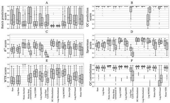 Six different performance metrics for batch effect removal (Section 4.4.5). Data from positive – or negative ion mode is indicated by plain and striped boxplots, respectively. (A) Batch prediction score measures the presence of batch effects in the first four principal components (PCs) from PCA analysis. (B) Quality Control (QC) prediction score measures how well QC samples are separated from human plasma sample in the first four PCs. (C) score between (normalized) abundancies and quantitative measurements. (D) Spearman score of (normalized) abundancies with quantitative measurements. (E) The WTR score measuring the overall within batch variation with respect to the total variance using the QC samples. (F) QC correlations measuring the resemblance of all QC samples among each other. Each data point represents a pair-wise Spearman correlation between two QC samples.