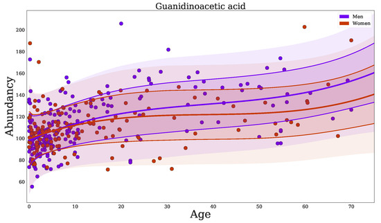 Regression of guanidinoacetic acid when using BC-Metchalizer normalized data. The different colors indicate the sex as shown in the legend. The thick red/blue line indicates the average obtained from the fit on all samples for a given sex. The first standard deviation is indicated by the thin(ner) line whereas the second standard deviation ends at the shaded region.