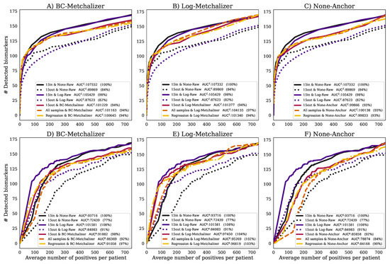 The number of detected expected biomarkers versus the average number of positives per patient. A curve in each (sub)figure was formed by increasing the Z-score or p-value threshold (, Methods). The legend indicates (per curve) the methods used to determine Z-scores and how data was normalized, the AUC and AUC expressed as percentage of the . Performances using (A) BC-Metchalizer and Z-scores, (B) Log-Metchalizer and Z-scores, (C) None-Anchor and Z-scores, (D) BC-Metchalizer and p-values, (E) Log-Metchalizer and p-values, and (F) None-Anchor and p-values.