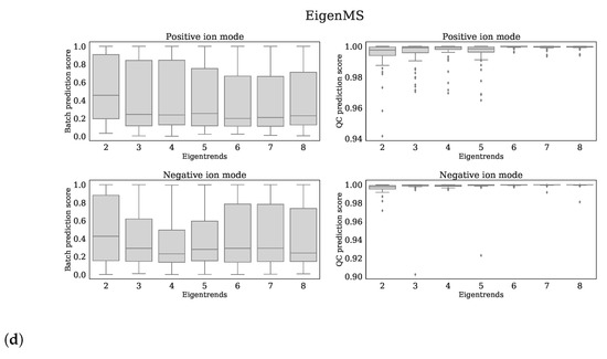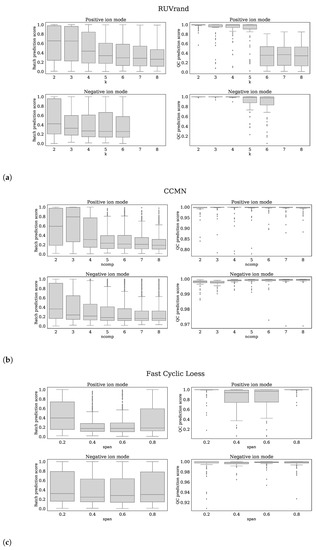 Based on the Batch prediction score and QC prediction score, we optimized the parameter settings for the following normalization methods: CCMN ncomp = 8 for both ion modi, EigenMS eigentrends = 6 for positive ion mode and eigentrends = 4 for negative ion mode, RUVrand k = 5 for positive ion mode and k = 4 for negative ion mode and Fast Cyclic Loess span = 0.6 for positive ion mode and span = 0.4 for negative ion mode. The reader is referred to Figure 5a–d for clarification of these choices.