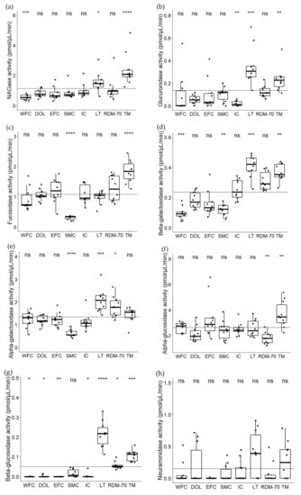 Glycosidase activities of (a) N-acetyl-β-glucosaminidase (NAGase), (b) β-glucuronidase, (c) α-fucosidase, (d) β-galactosidase, (e) α-galactosidase, (f) α-glucosidase, (g) β-glucosidase and (h) N-acetyl-α-neuraminidase, in milk from Western Finncattle (WFC), Norwegian Doela cattle (DOL), Eastern Finncattle (EFC), Swedish Mountain cattle (SMC), Icelandic cattle (IC), native Lithuania Black and White cattle (LT), Danish Red anno 1970 (RDM-70) and Norwegian Telemark cattle (TM). The horizontal line in each box indicates the median and the overall horizontal line indicates the mean of all samples in the study. Stars indicate significant differences from the overall mean: * p < 0.05, ** p < 0.01, *** p < 0.001, **** p < 0.0001, ns = not significant.