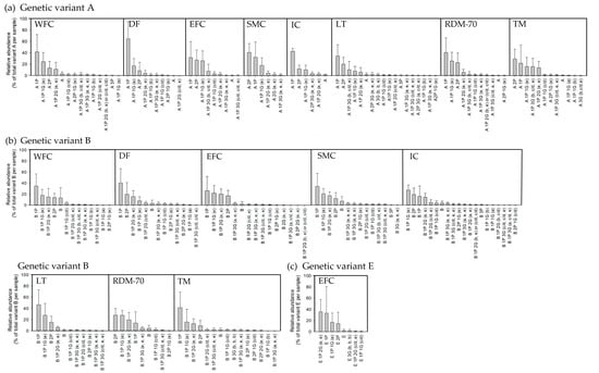 Prevalence of distinct glycomacropeptide (GMP) isoforms relative to total GMP (mean ± SD). (a) Genetic Variant A, (b) genetic Variant B and (c) genetic Variant E in milk from Western Finncattle (WFC), Norwegian Doela cattle (DOL), Eastern Finncattle (EFC), Swedish Mountain cattle (SMC), Icelandic cattle (IC), native Lithuania Black and White cattle (LT), Danish Red anno 1970 (RDM-70), Norwegian Telemark cattle (TM). A, B and E = genetic Variants A, B and E, P = phosphorylation, G = glycans, a–e = the five common O-linked glycans attached to κ-CN.
