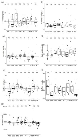 Free sugars analyzed by 1H NMR spectroscopy. (a) fucose, (b) galactose, (c) glucose, (d) sialic acid, (e) N-acetyl-galactosamine (GalNAc), (f) N-acetyl-glucosamine (GlcNAc) and (g) lactose, in milk from Western Finncattle (WFC), Norwegian Doela cattle (DOL), Eastern Finncattle (EFC), Swedish Mountain cattle (SMC), Icelandic cattle (IC), native Lithuania Black and White cattle (LT), Danish Red anno 1970 (RDM-70) and Norwegian Telemark cattle (TM). The horizontal line in each box indicate the median and the overall horizontal line indicates the mean of all samples in the study. Stars indicate significant differences from the overall mean: * p <0.05, ** p < 0.01, ns = not significant.