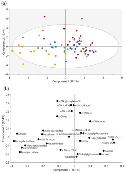 A two-component PCA model was constructed, based on the quantitative data of glycosidases and glycans including; OS, O-linked glycans attached to GMP isoforms, monosaccharides and lactose. The model explains 18.1% and 12.4% of the total variation on the two first principal components, respectively (PC1 and PC2; Figure 4a,b).