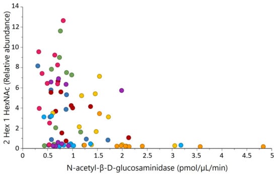Three out of the 11 major correlations between glycosidases and glycans were selected and presented in Figure 5 and Figure 6, as well as in Appendix A Figure A1, as these relations were of high biological interest. Figure 5 shows the major neutral OS with composition 2 Hex 1 HexNAc, which was negatively correlated with N-acetyl-β-d-glucosaminidase activities (r = −0.40, p < 0.001), indicating a cleavage of HexNAc residues. Figure A1 displays the negative correlation between one of the major the acidic OS, 6′-sialyllactose (6′-SL), and activities of N-acetyl-α-neuraminidase (r = −0.27, p = 0.024).