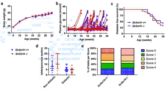 Slc6a19 deficiency in NOD mice does not alter body weight, incidence or timing of diabetes development, or severity of insulitis. (a) Body weight (g) and (b) fed-state plasma glucose (mmol/L) measured in the morning from weeks 6–30 of age, or until the time of diabetes diagnosis. Data are presented as mean ± SEM; Slc6a19+/+, n = 37; Slc6a19−/−, n = 29. (c) Diabetes free survival from weeks 6–30 of age. Slc6a19+/+, n = 37; Slc6a19−/−, n = 29; Mantel-Cox log rank test: p = 0.37. (d) Total number of islets per pancreas section according to genotype and diabetes status. Slc6a19+/+, n = 37 (n = 15 non-diabetic, n = 22 diabetic); Slc6a19−/−, n = 26 (n = 9 non-diabetic, n = 17 diabetic). (e) Number of islets at each grade of insulitis (grades 0–4) according to mouse genotype. Slc6a19+/+, n = 34; Slc6a19−/−, n = 26.