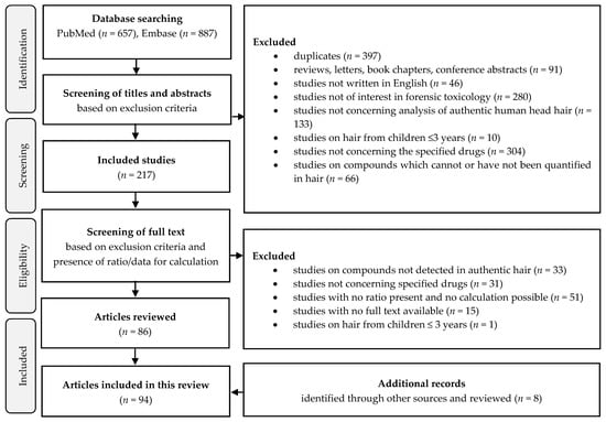 A total of 94 studies were included in this review. The study selection process is shown in a flow chart (Figure 1) and prepared according to the PRISMA guidelines. Studies with reported MD ratios or studies in which the calculation of MD ratios were possible were included. The MD ratios of drugs of abuse that are not legal pharmaceuticals and their metabolites were excluded from the present review as they have previously been explored in detail [10,11,12,13]. In addition, non-marketed pharmaceuticals were excluded. The MD ratios of morphine and codeine were omitted from the present review because it was difficult to distinguish therapeutic use from abuse and thus differentiate the ratios after morphine, codeine, and heroin intake.