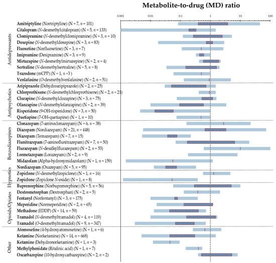 Information on MD ratios of each pharmaceutical was obtained directly from the studies, from the calculation of the reciprocal value of reported drug-to-metabolite ratios, or calculated from visible and unmerged drug and metabolite concentrations in studies where no ratio was reported. Only concentrations above the lower limit of quantification or below the upper limit of quantification were included. The calculated MD ratio range was reported in this paper, and for studies with >10 included individuals or segments, percentiles were also reported. In addition, the mean and median MD ratios were calculated, if possible. Studies with children aged ≥ 4 years were included and the term children was used for individuals aged 4–9 years. MD ratios of pharmaceuticals and metabolites, which both can be ingested as the main drug, were excluded if intake of both was specified. This applied to diazepam and temazepam, among others.