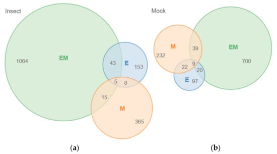 Of the 13,950 unique peaks, 1521 and 957 peaks were significantly different (up- or down-accumulated) in at least one genotype compared to Benning upon insect and mock treatments, respectively (paired t-test, p < 0.05). EM demonstrated the greatest number of differences, with 1064 and 700 peaks different from those of Benning under insect and mock treatments, respectively (Figure 1). M had the second greatest number of differences, with 365 and 232 under insect and mock treatments. EM and M shared 39 differences under mock treatment and 15 in response to insect. In contrast, the number of peaks shared by EM and E increased from 20 to 43 in response to the insect treatment. A list of shared peaks is provided in (Supplementary Table S1).