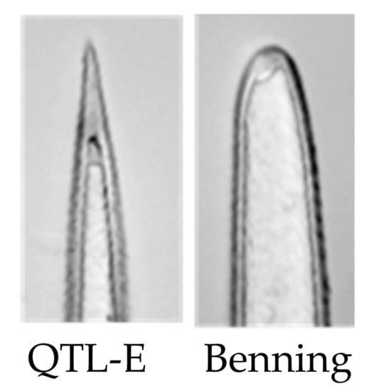 Trichomes of QTL E in the Benning background have sharp tip shape, whereas insect-susceptible Benning does not.