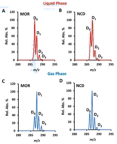 Comparison of HDX that happens in the liquid phase and the gas phase. MOR represents morphine and NCD represents norcodeine. Mass spectra for (A) morphine (MOR), (B) norcodeine (NCD) after conducting liquid-phase HDX, (C) MOR, and (D) NCD after conducting gas-phase HDX.