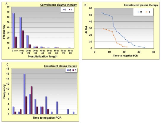 The effect of convalescent plasma on hospitalization length and time to negative PCR. (A): The frequency of patients in different categories of hospitalization length. (B,C): Correlations between convalescent plasma and time to negative PCR. The 0,1 (blue and red columns) are the patients who were not treated with convalescent plasma and those treated with it, respectively. The time measured in days of hospitalizations.