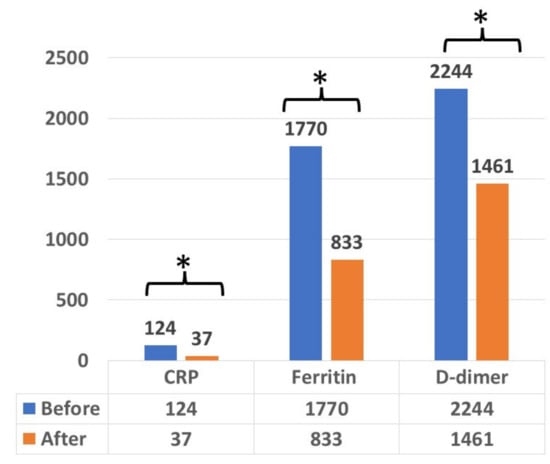 The effect of convalescent plasma on inflammatory markers (D-dimer, ferritin and CRP) in all patients treated with convalescent plasma. The measurements were done upon admission and 3–5 days after convalescent plasma perfusion. The asterisks mean the observed significance levels. (p-value < 0.05).