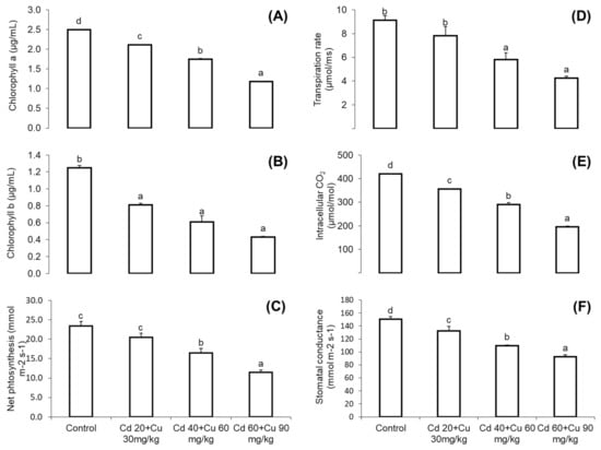 The effect of different Cd and Cu concentrations (0, Cd 20 + Cu 30 mg/kg, Cd 40 + Cu 60 mg/kg, and Cd 60 + Cu 90 mg/kg) on the chlorophyll a (A), chlorophyll b (B), net-photosynthesis (C), transpiration rate (D), intercellular CO2 (E), and stomatal conductance (F) on the leaves of the pigeon pea. Different letters represent significant differences between the treatments at p ≤ 0.05.