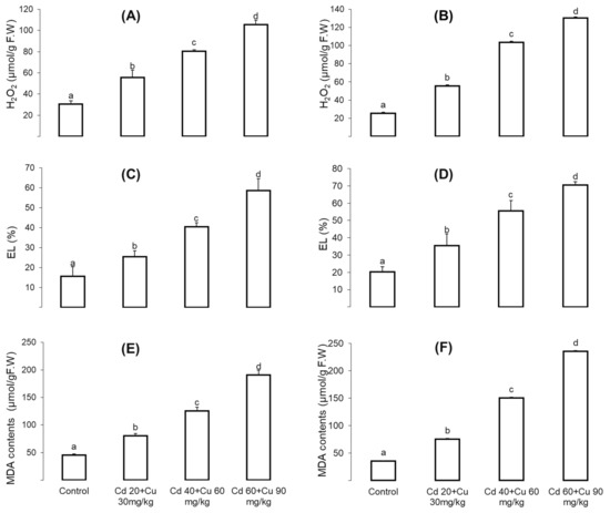 The effect of different Cd and Cu treatments (0, Cd 20 + Cu 30 mg/kg, Cd 40 + Cu 60 mg/kg, and Cd 60 + Cu 90 mg/kg) on the shoot (A,C,E) and root (B,D,F) H2O2, EL, and MDA contents of pigeon pea plants. Bars represent means from the three independent replicates (±, n = 3); different letters indicate significant differences between the treatments at p < 0.05.