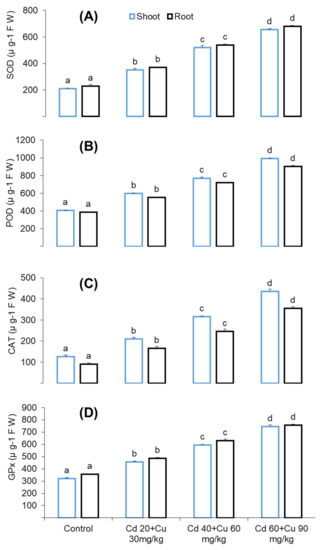 The effect of different cadmium and copper concentrations (0, Cd 20 + Cu 30 mg/kg, Cd 40 + Cu 60 mg/kg, and Cd 60 + Cu 90 mg/kg) on shoots and roots’ antioxidant enzymes, namely, SOD (A), POD (B), CAT (C), and GPX (D) contents in pigeon pea plant. Bars represent means from the three independent replicates (±, n = 3); different letters indicate significant differences between the treatments at p < 0.05.