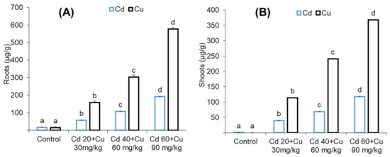 The effect of different cadmium and copper concentrations (0, Cd 20 + Cu 30 mg/kg, Cd 40 + Cu 60 mg/kg, and Cd 60 + Cu 90 mg/kg) on shoot (A) and root (B) metal accumulation of cadmium and copper in pigeon pea plant. Bars represent means from the three independent replicates (±, n = 3); different letters indicate significant differences between the treatments at p < 0.05.